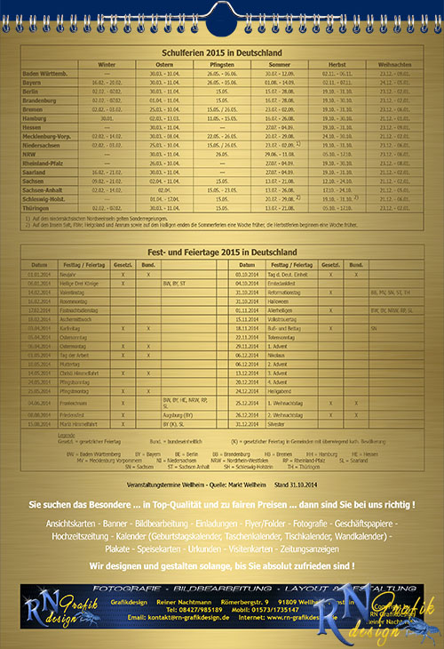 Zusätzliches 14. Kalenderblatt mit Schulferien und Feiertagen